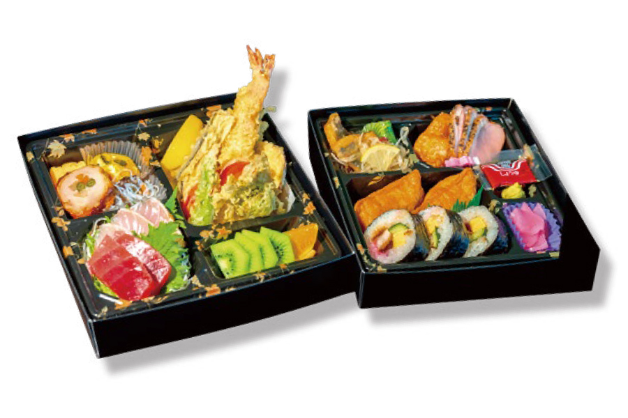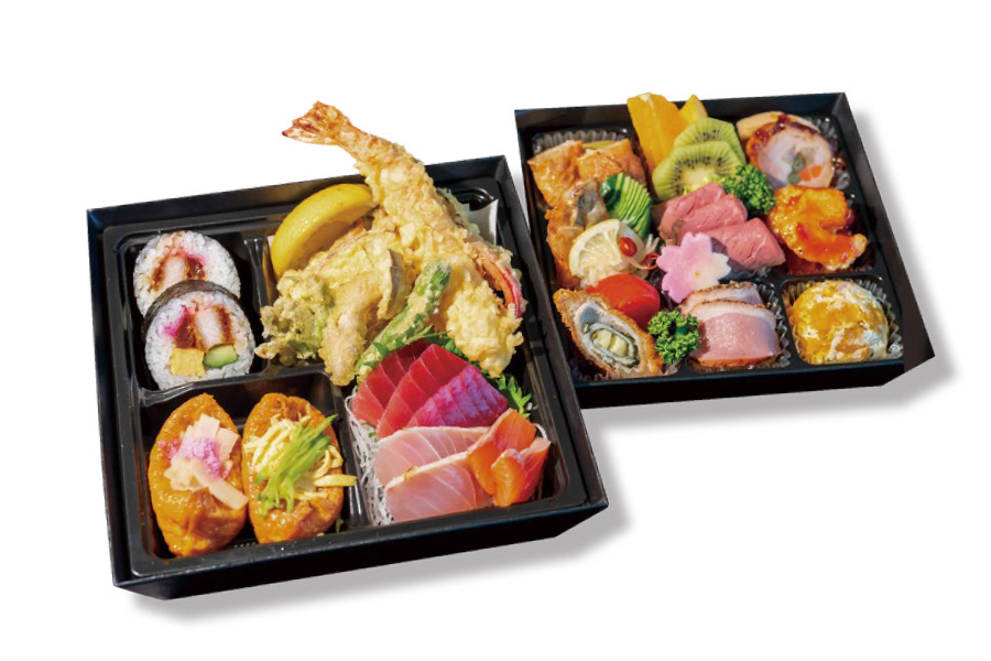 お刺身や天ぷらなどの人気メニューはもちろん、肉料理や太巻き寿司、フルーツまで入った満足お弁当。