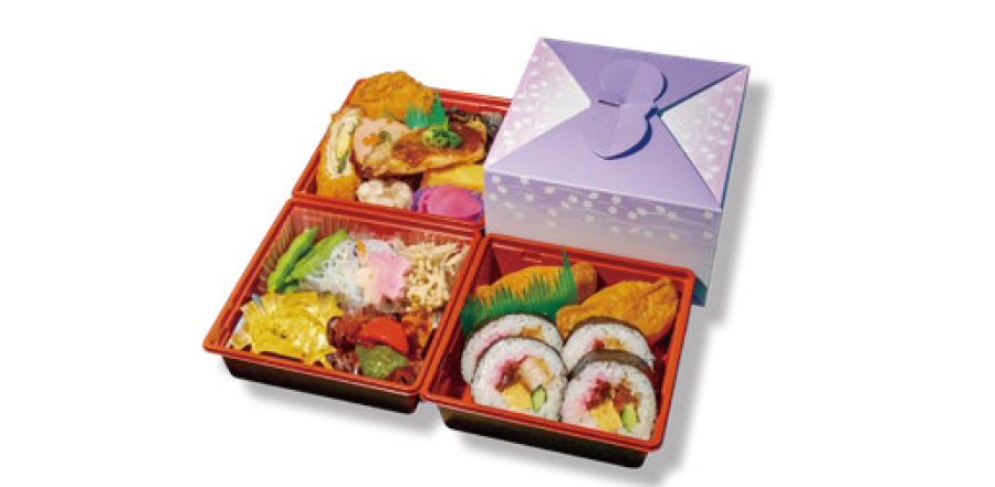 ミニ重箱のようなケースに入った3段弁当。ボリュームやおいしさはもちろん、食事を楽しく演出。
