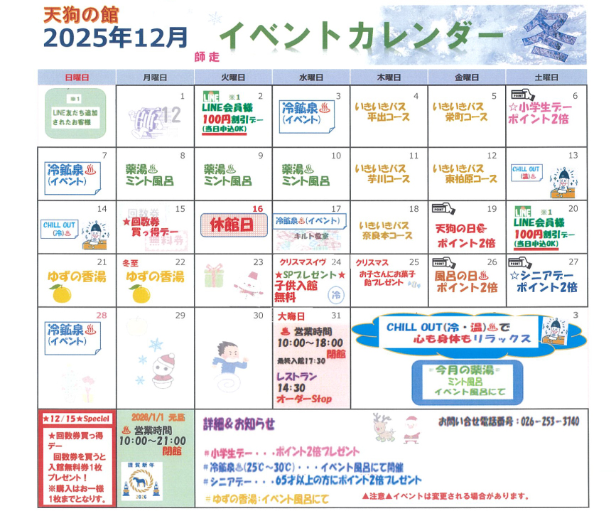 いろいろなイベントを開催いたします。お気に入りをチェックしてぜひ冬の温泉へお越しください。